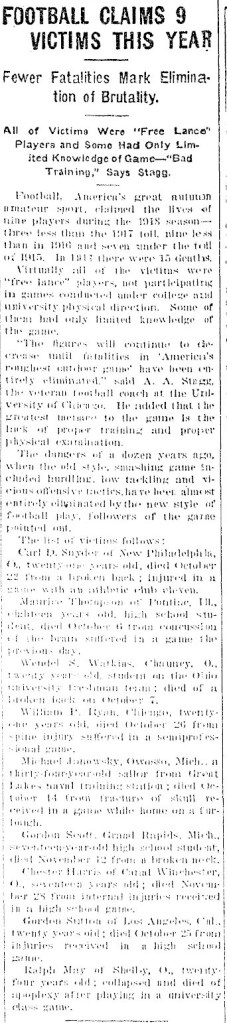Back to the historic article, considering how few people must have been playing football in 1919 compared to 2019 where millions of young people are on the field, nine deaths seems like a lot, especially when you list the ways in which these men died, most of whom are teenagers and early 20-somethings: broken back, concussion, spinal injury, skull fracture, broken neck, internal injury, and apoplexy (cerebral hemorrage). It’s just brutal.