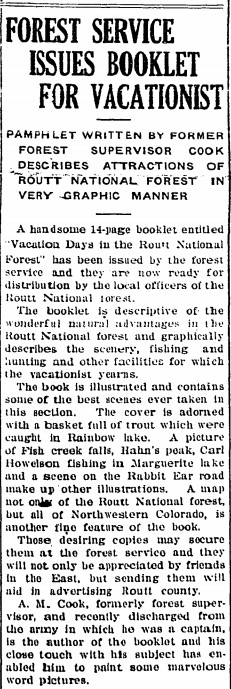 100 years ago today, the Forest Service plugs Routt National Forest as a hot destination for a new segment of the rising working class known then as vacationists, who finally had enough money and time off work to play tourist in the beautiful state of Colorado in which they live.