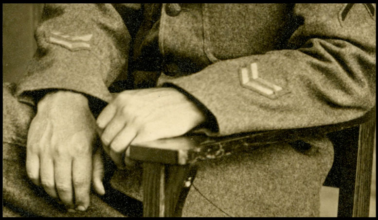 The gold chevron for wounds is the same as the gold chevron for each six month’s service abroad, but it’s worn on the left sleeve instead of the right.