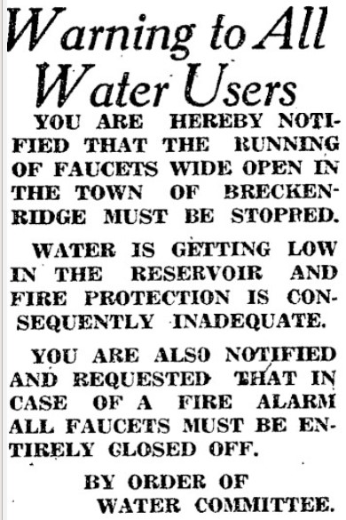 100 years ago today, Breckenridge residents were leaving their water running full blast all night to prevent their pipes freezing, and the town issued warnings that the tiny Sawmill Reservoir was drying up and leaving the town in danger of fire that couldn’t be stopped because the water pressure and level was so low.
