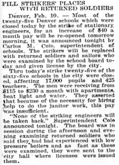Meanwhile at schools in Denver, stationary engineers — who maintained Denver Public Schools’ boilers and furnaces as well as performed janitorial duties — no doubt inspired by events in Seattle, went on strike for higher pay, which shut down 25 of the 65 existing schools in the district.